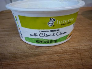 In a small bowl combine 8-oz. container herb and onion cream cheese, 1/4 cup cheddar cheese and 1/4 cup chopped green onion.