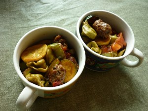 This is another dish I make frequently when I’m in a hurry. There are no specific ingredients, just a description. I buy fresh tortellini, any flavor or size package, from the deli section of the grocery. Prepare it according the directions on the package. While that water is boiling, fry up about a pound of Italian sausage, either bulk or links. If using links, slice them once they’re cooked . . . or before cooking. The goal here is to try for pieces of vegetables and meat which are of the same size as the tortellini. Don’t ask me why, it just seems to be more pleasing to the eye. Once the sausage is cooked, remove to a large serving bowl. In the same frying pan as you cooked the sausage, heat olive oil and stir-fry onion, pepper (bell, Anaheim, whatever kind seems good to you), garlic, zucchini, yellow squash, mushrooms, parsley, and/or cherry tomatoes (or chopped tomato flesh). Once the vegetables are sauteed appropriately, add them to the sausage in your big serving bowl. Once the tortellini is cooked, drain and rinse with cold water to stop the cooking process. Add tortellini to the bowl. Add a can of sliced black olives and a can of artichoke hearts (or cooked fresh or frozen). You don’t need to have all these ingredients all the time. Make a vinaigrette of balsamic vinegar and olive oil. When I made this dish the other night, unexpected visitors showed up and I couldn’t keep them out of the tortellini long enough to make the vinaigrette so I just splashed balsamic vinegar over the top and then drizzled olive oil over all, stirred it around and served it to rave reviews. It’s really not a fussy dish. Serve with garlic bread. You’ll be the toast of the neighborhood, or at least the toast of the house.