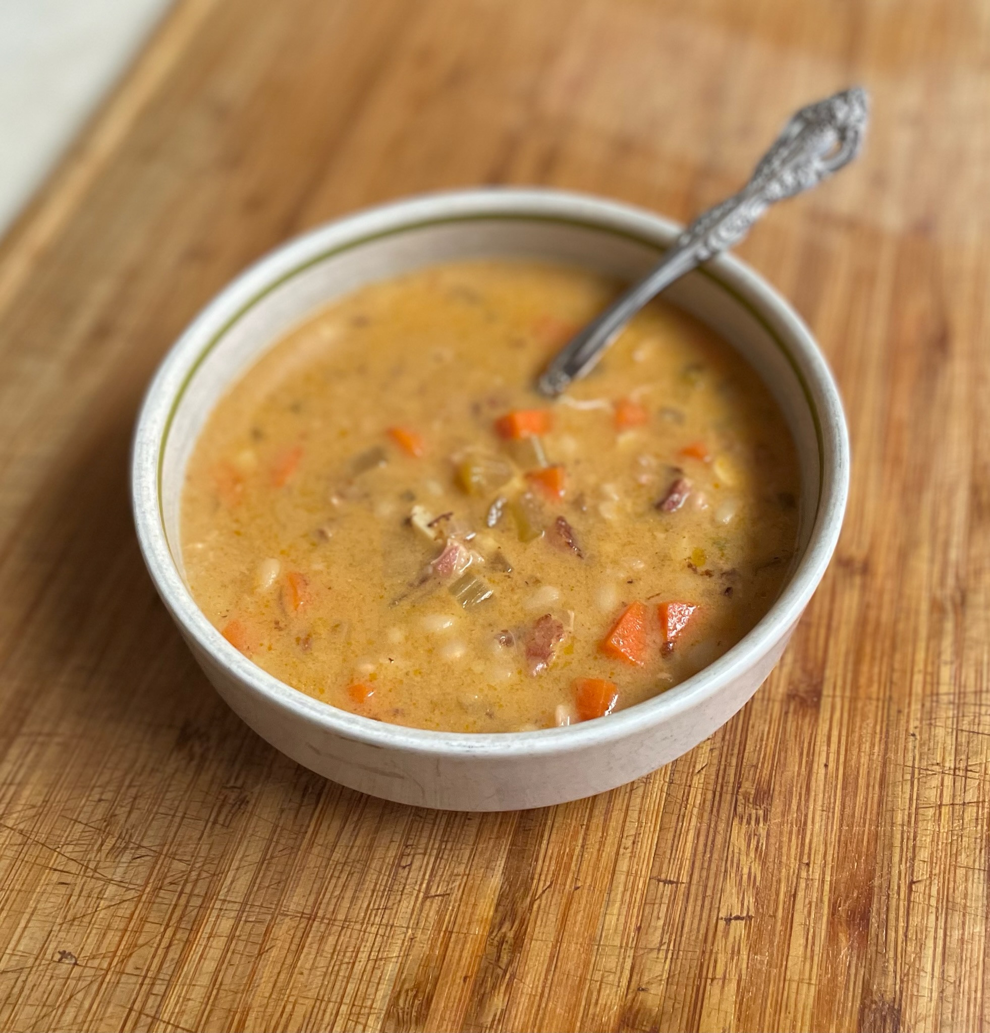 NOTES: If you want to use dried beans, then you’ll have to start early and rehydrate them according to directions I’m sure you can find elsewhere. I usually make this using one 14 oz. can of beans. I use 2 Tbsp. flour to about a cup of dairy liquid. Sometimes it’s really a thick soup and sometimes not. It’s all good. You could make this gluten-free by using gluten-free flour. You could make this dairy-free by omitting the slurry altogether. That is still a very good Bean with Bacon Soup, I just happen to like it with a bit of dairy.