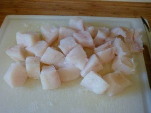 Cut halibut into 1″ chunks, approximately. Dredge halibut through flour, you’ll probably need about a cup of flour for this.