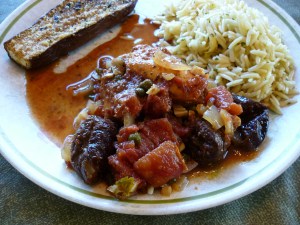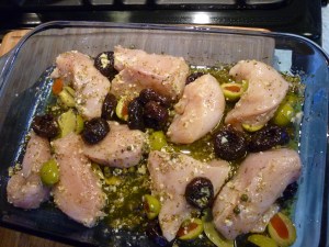 Into a 9×13″ baking dish, mix together: pureed garlic, dried oregano; Salt and pepper; red-wine vinegar; olive oil; pitted prunes; green olives (mine were jumbo-sized, so I cut them in half); capers with a little juice; bay leaves