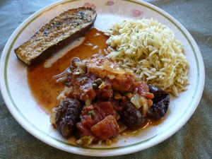 This is a great dish when you’re feeding a crowd. It should be prepared the night before, but I’ve done it just a few hours ahead and it’s still delicious. I also have a similar recipe which uses green olives and no tomatoes. Some day I’ll make and post that one.