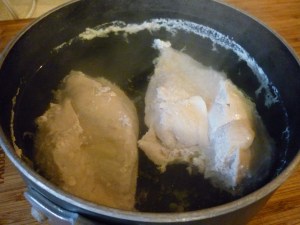 For the chicken paprika dish, I cut up a 6 lb. chicken into a large pot, covered with water and cooked the chicken until it was done. 6 lbs turned out to be way more than I needed, so I only used half of the breast and one thigh, deboned, along with broth created by the cooked chicken.