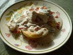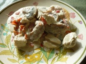 There are many ways to make Chicken a la King. This way is my favorite. It is based upon the recipe in Betty Crocker’s Cookbook (Golden Press 1972). In a pinch, you could use leftover chicken or turkey and canned broth. You could also use canned mushrooms. My way has better flavor. Served over popovers makes it fun. I will post the popover recipe as well.