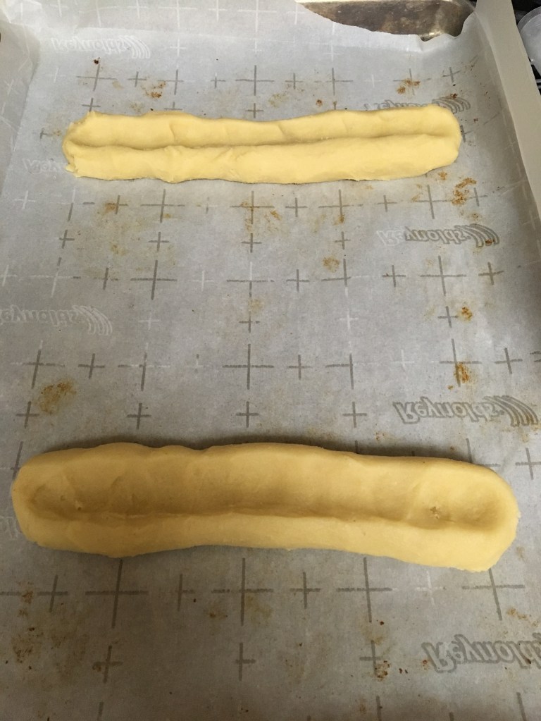 Preheat oven to 350 degrees F. Prepare two baking sheets with parchment paper or Silpat. Divide dough into four portions and shape each portion into a log of about 2-1/2″ around and 10″ long. Place two logs on each baking sheet. Make a 1/2″ depression lengthwise along the top of each log. Bake 10 minutes.