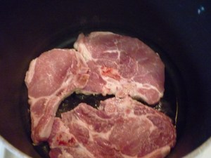 In a large deep skillet or kettle, heat 1-1/2 Tbsp. oil and add 4-6 pork steaks (in batches if necessary), frying till browned on both sides. Remove from skillet and discard fat.