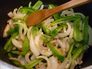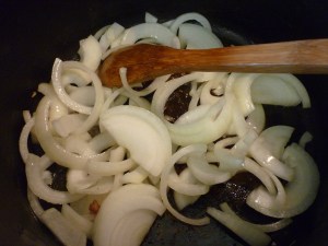 Heat another 1-1/2 Tbsp. oil in the skillet and add 2 medium onions, sliced. Heat, stirring occasionally, for 3-5 minutes until lightly browned.
