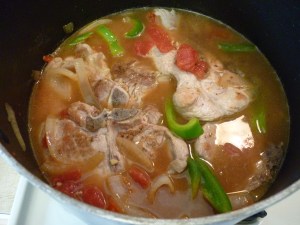 Return pork steaks to the pan and add enough water to just barely cover. Stir around so everything is mixed well and the pork chops are mostly covered.