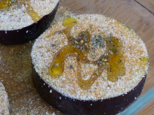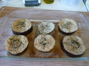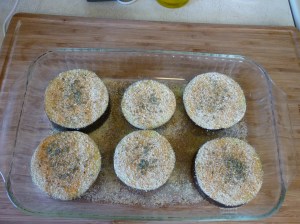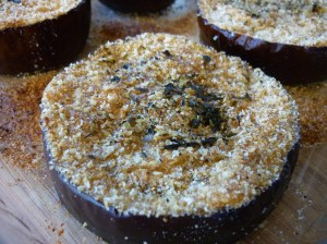 Slice an eggplant crosswise into 1″ slices. Drizzle olive oil into a 9X13″ pan. I start with a couple tablespoons of olive oil. Dip each eggplant slice into olive oil so that each side of the slice is coated. You will need to add more olive oil as you go through the slices. As you’re done coating a slice, just slide it to one edge of the pan. When finished, both your pan and your eggplant should be coated with olive oil. Lay the eggplant out in a single layer (I have done this by offset stacking and it works, too, just not as pretty). Now, sprinkle the top of each slice with bread crumbs. Sprinkle the bread crumbs with seasoned salt, pepper, oregano, basil, and parsley (whatever floats your boat). Drizzle a little more olive oil over the top, not much. Bake at 350 degrees for about 40-45 minutes. You can stick a fork in one slice and it should feel quite tender.