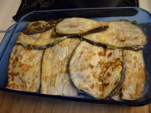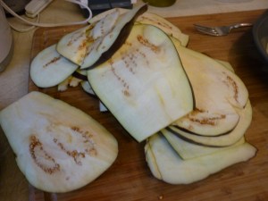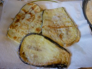 Cut 3 eggplant lengthwise into 1/2-inch slices. Score the skin with a knife. Sprinkle each slice with salt and let drain onto paper towels for thirty minutes. Note: I had one very large eggplant — it wasn’t enough as you will see below.