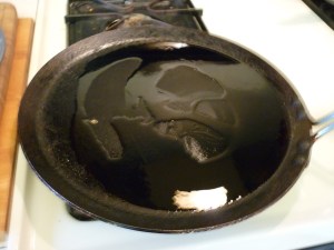 Heat cooking oil (about 1/2″) in a skillet. I never test my heat, so I’m not sure what the temp should be. Hot.