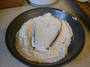 Spice up a bit of cornmeal. I used salt and pepper and a liberal amount of white pepper. Whatever you want to do will be fine.