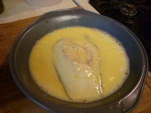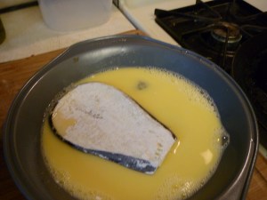 Dip the eggplant pieces, in batches, in the egg and then dredge through the seasoned cornmeal, then into the frying pan. Turn pieces over after a couple minutes, then make sure the eggplant is thoroughly cooked.