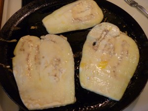 We invited dinner guests who had given up meat for Lent, so we enjoyed grilled cheese sandwiches, broccoli cheese soup, classic salad and cranberry cake. We had provolone tomato sandwiches and fried egg cheddar sandwiches. What I want to tell you about is the Eggplant Provolone Sandwich. I’ve become such a huge fan of eggplant. You will see more recipes in the coming weeks. I discovered that a lot of that salting and draining, and whatever it is that they do to eggplant before actually cooking with it, is often a huge waste of time. What I’ve described below works for me and tastes sweet and delicious.
