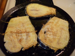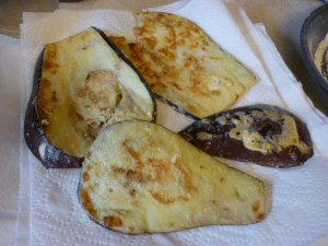 - Pat eggplant slices with paper towel to remove moisture and fry slices in olive oil until mostly cooked through.