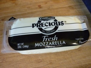 Slice about a pound of mozzarella cheese. I like to use fresh mozzarella and this was only 12 ounces, but it was quite enough. I’ve also used shredded Mozzarella, it all works.