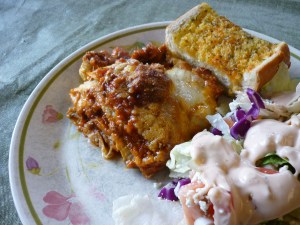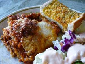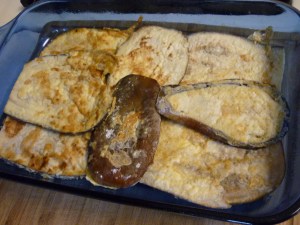 Make a white sauce by melting 1/2 cup butter in a large saucepan over medium heat and stirring in 6 Tbsp. flour. Continue stirring until flour-butter mixture bubbles for awhile. Stir in 4 cups milk. Keep stirring frequently over medium heat until it’s thick and bubbly. Add salt and white pepper to taste. Remove from heat. When ready to assemble, place one layer of eggplant in the bottom of a 9×13″ baking dish. Cover the eggplant with all of the meat mixture. Sprinkle meat mixture with 1/2 cup grated or shredded Parmesan cheese. Cover that layer with remaining eggplant slices. Sprinkle with 1/2 cup Parmesan cheese.
