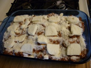 Layer 1/2 of the pasta sauce and 1/2 of the Mozzarella cheese. Sprinkle with a bit of grated or shredded Parmesan cheese.