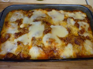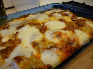 This is an easy and interesting dish to prepare, plus it is delicious! Its combination of spices lends itself well to wild game, but any type of ground meat would probably do. I have consistently failed to buy enough eggplant to make this properly, but it works out well enough. Some day I will look at the eggplants in the grocery and tell myself I need more, not less. Another addition you might consider is a layer of thinly sliced sauteed potatoes on the bottom of the baking dish. I think you would want to have a baking dish with very high sides.