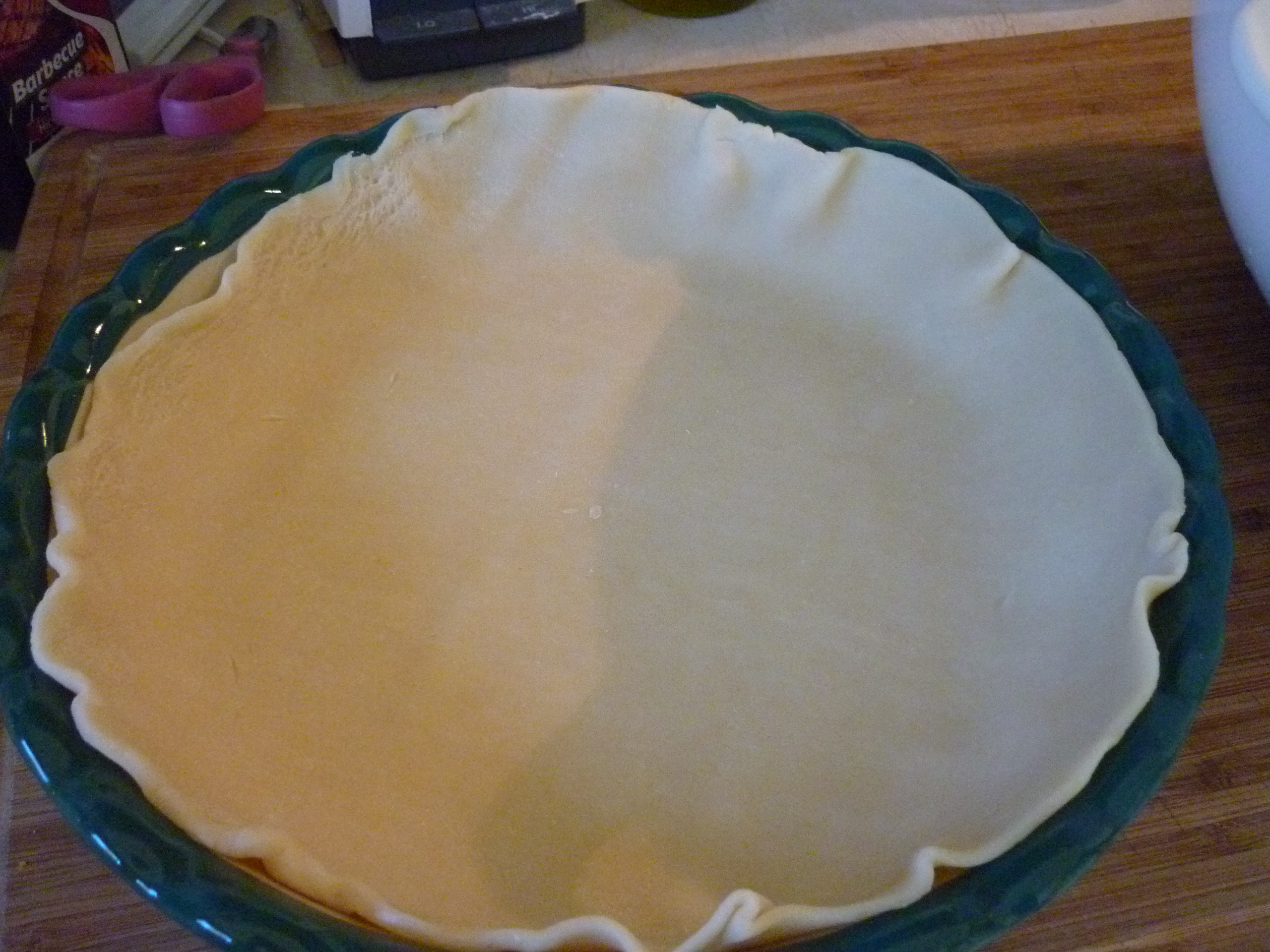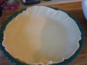 Place bottom crust into 9″ pie plate. Note my pie plate is a little big, but it works well, no problem.