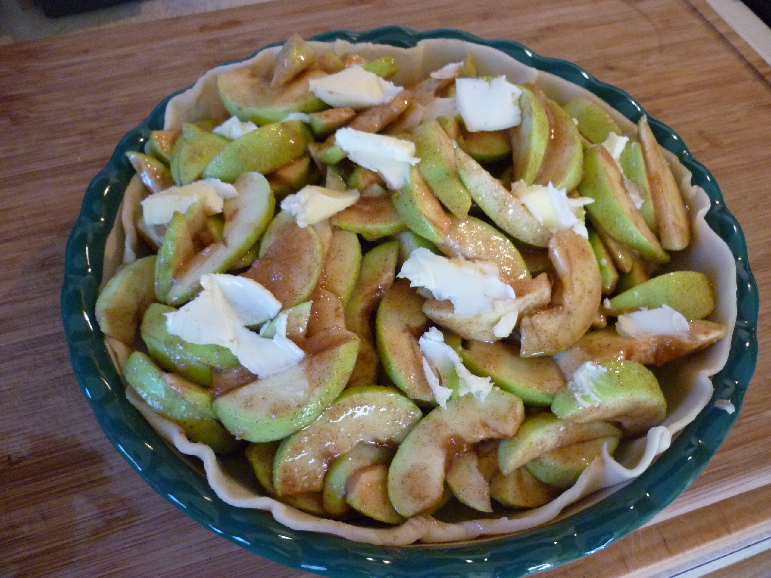 Yesterday we picked apples at an orchard down the hill from where I live. The type is called Lodi. The largest ones were as big as tennis balls. This is Alaska after all, the growing season is too short for that type of fruit. Normally, I would peel 5 or 6 Granny Smiths in order to make this sublime Dutch Apple Pie, but because these apples were so small I only cored them. I think it will be fine with the peel on. Another confession: I cannot make a pie crust from scratch. I have tried many times and never succeeded. So, I always use the kind found in the refrigerated section at the store, the ones that need to be unrolled. Terrible cheating, I know. What makes it a “Dutch” apple pie? It’s the cream added at the end. Oh, yummy! This recipe is based upon one found online at Teri’s Kitchen.
