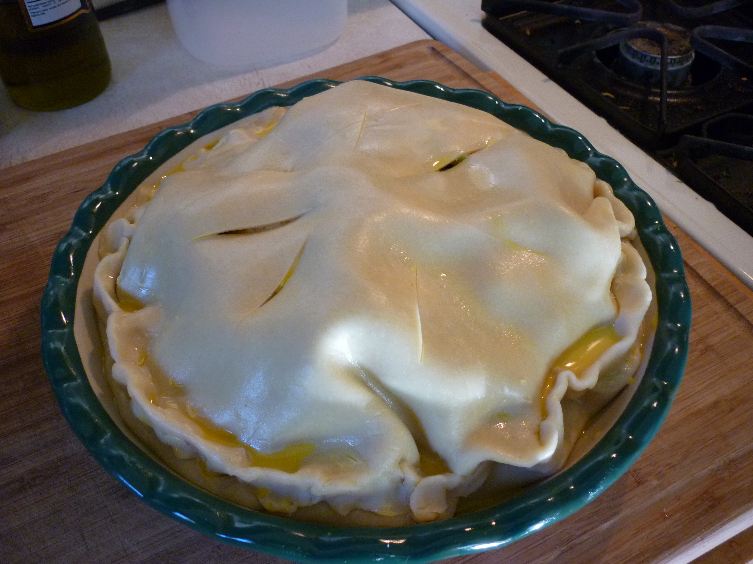 Place crust on top of apples and crimp with bottom crust to seal. Brush top crust with egg wash. It makes a beautiful shiny brown color when finished.