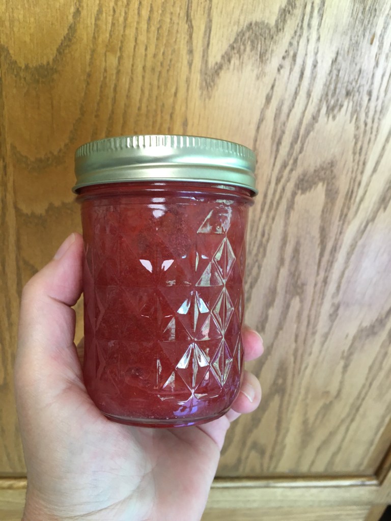 I usually, not always, use Certo Liquid Fruit Pectin for my jam. The recipe booklet that I use is from 1975 when the liquid pectin came in bottles. Now the pectin comes in sealed envelopes and each envelope is equivalent to one half-bottle. As you can see, my recipe booklet is falling apart. The new recipe sheet that comes inside the packages now isn’t as comprehensive as the old one. I do not water-bath can my jam. There is enough sugar in it to act as a preservative. Using canning lids keeps air from getting in. When I was a child, my mother only used paraffin to cover the jam and many people still do it that way.