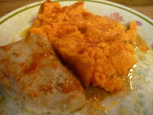 I really like sweet potatoes except for canned sweet potatoes with copious amounts of sweetener added. The whole marshmallow topping thing is so unctuously sweet that . . . okay, enough of the trash talk. Here is what I like. I’ve used this recipe for many years and can’t remember where I originally got it, but just found it online at food.com. The recipe calls for fresh sweet potatoes (red yams) and very little sweetener. The pictures illustrate a smaller batch than is called for in the recipe, so use them as a guide on how to do it, but use the recipe for the amounts. I served the dish with shrimp salad, corn muffins, and pork roast that had been slowly baked in mango salsa. A couple days later I took the leftover pork and sweet potatoes, added grated cheese and refried beans and rolled it all up into tortillas for tasty burritos. Two days worth of good eats!